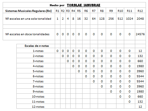 Nótese en la imagen anterior como la secuencia de la columna Vértices 0-caras es igual a la secuencia del número de escalas en una tonalidad en los sistemas musicales regulares y que la secuencia de la columna Aristas 1-caras es igual a la del número de escalas en todas las tonalidades en los sistemas musicales regulares, que se mostrará en la siguiente tabla. He acotado los sistemas musicales regulares hasta el 12 por cuestión de espacio, pero podría continuar hasta infinito (y también lo he acotado a doce porque en este sistema o matriz que se genera, al parecer el 12 es como un punto de equilibrio, pero no lo puedo asegurar con total certeza porque tengo que observarlo e investigarlo más a fondo). La siguiente imagen se puede leer por columna así: el Sistema Musical Regular R12 (Temperamento Igual) tiene 2048 escalas en una sola tonalidad y 24576 escalas en todas sus tonalidades y tiene (en una sola tonalidad) 1 escala de una nota, 11 escalas de dos notas, 55 escalas de tres notas, 165 escalas de cuatro notas, etcétera. :